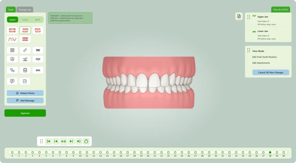 Plan and preview tooth movements in a visual timeline with adjustable speed, sequence, and direction. Separate controls for rotation and translation, plus real-time collision detection, ensure precise and safe outcomes.